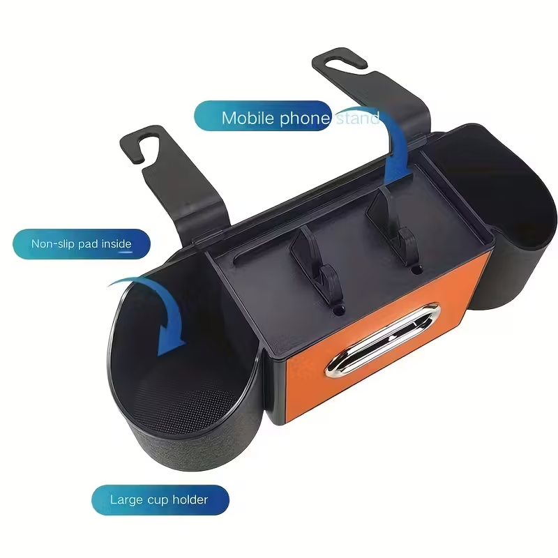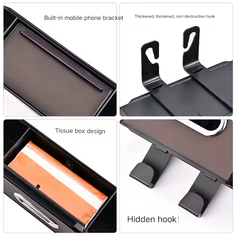 4-IN-1 MULTIFUNCTIONAL DESIGN - Keep your car's interior perfectly organized. This unit combines a tissue dispenser, dual cup holders, a phone stand, and bag hooks, placing all your essentials neatly within easy reach for passengers.