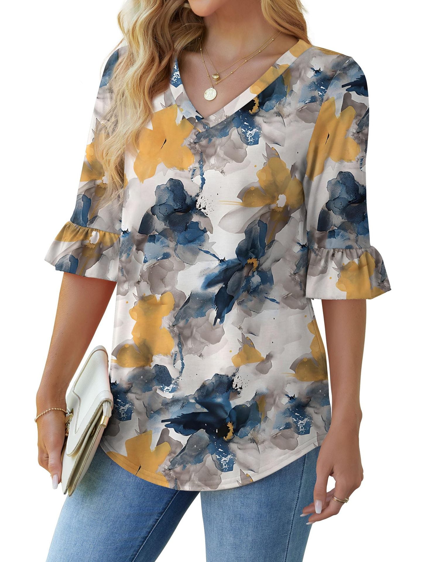 💕Limited time sale 50% off👚Womens 3/4 Length Sleeve V-Neck Eyelet Casual Ruffle Sleeve Tunic Blouses