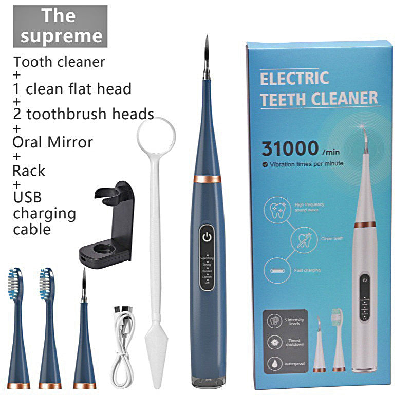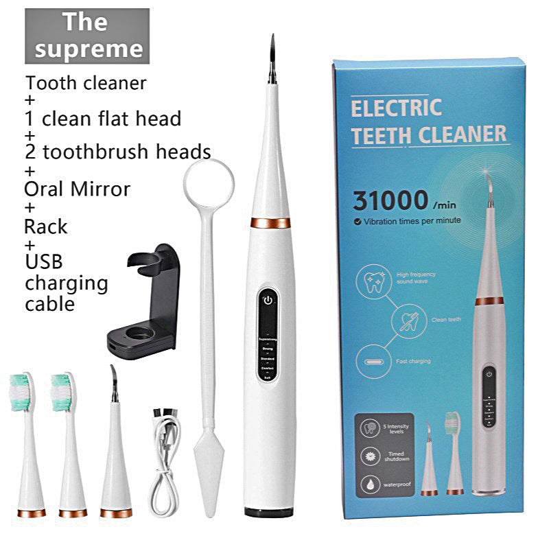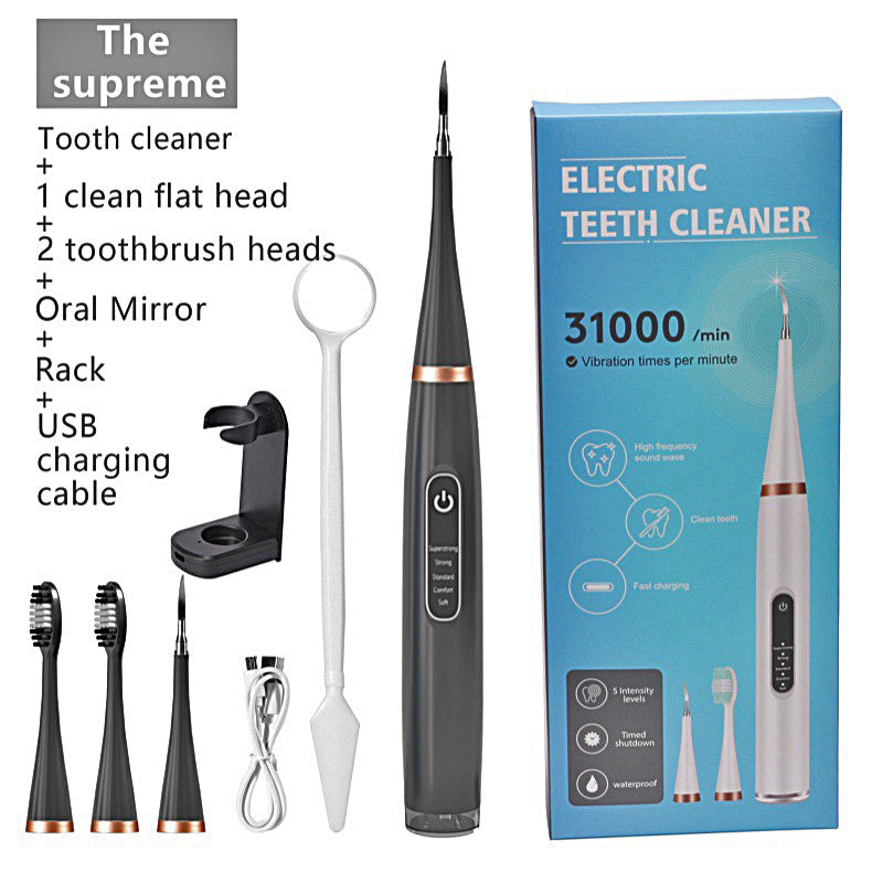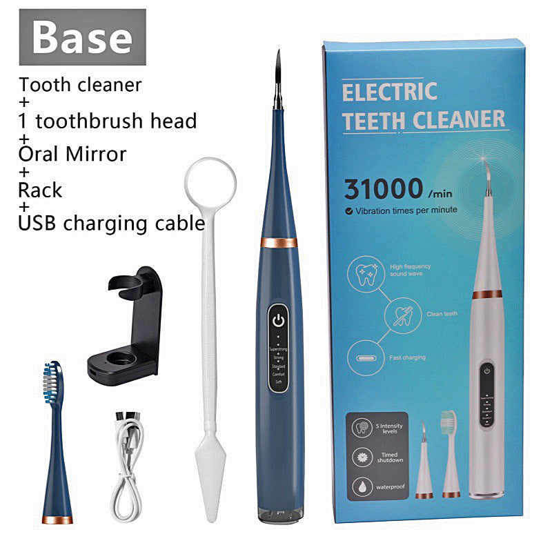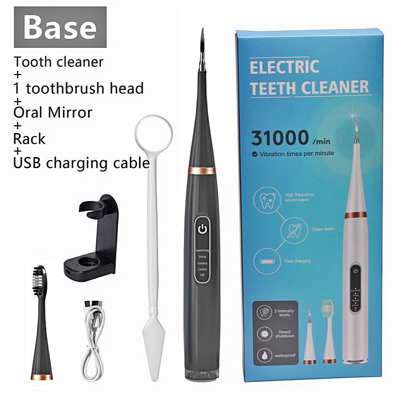 Package Includes:1*Electric Ultrasonic Dental Scaler+1*Toothbrush Head+1*Oral Mirror+1*Rack+1*USB Charging Cable (Basic Version), 1*Electric Ultrasonic Dental Scaler+1*Clean Flat Head+2*Toothbrush Heads+1*Oral Mirro+1*Rack+1*USB Charging Cable