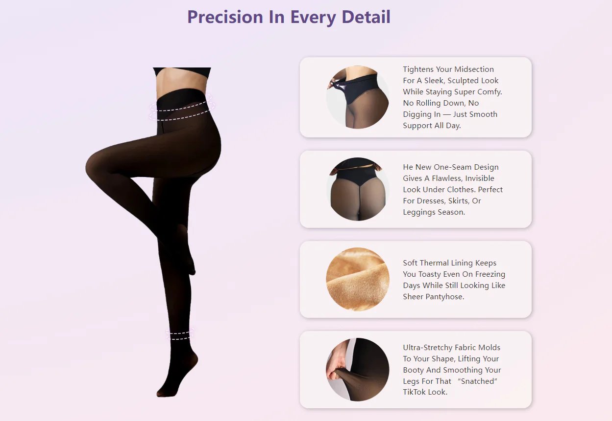 Lined with ultra-soft baby fleece for cozy warmth without bulk. Super-stretch fabric hugs your legs naturally, moves freely, and creates a flawless sheer effect that looks just like real skin.
