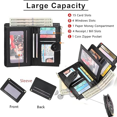 Large Capacity: Our women fashion wallet has 15 card slots + 4 ID windows+ 4 Bill slots + 1 full-length compartment + 1 zipper coin pocket ( 1 removable card sleeve including 1 card slot and 1 ID window). The bill compartment can hold up 30 pieces of dollar bills. This bifold wallet isroomy enough for fitting plenty of cards, change, bills, and coins.